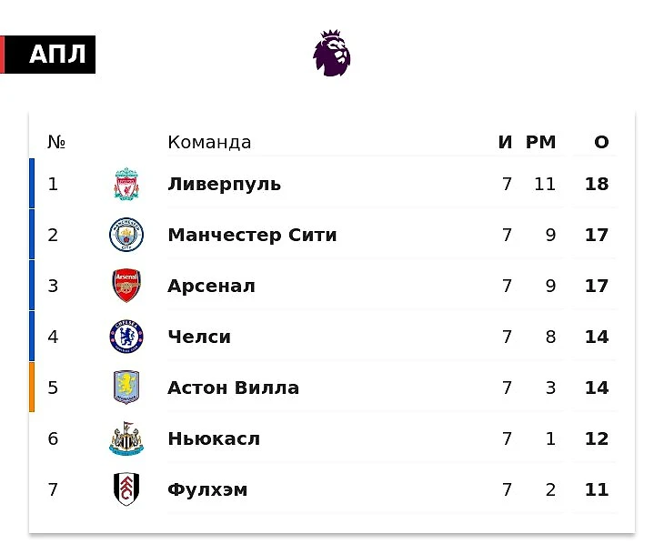 «Ливерпуль» лидирует в АПЛ после 7 туров. «Ман Сити» и «Арсенал» отстают на очко, «Челси» и «Вилла» – на 4. «МЮ» идет 14-м