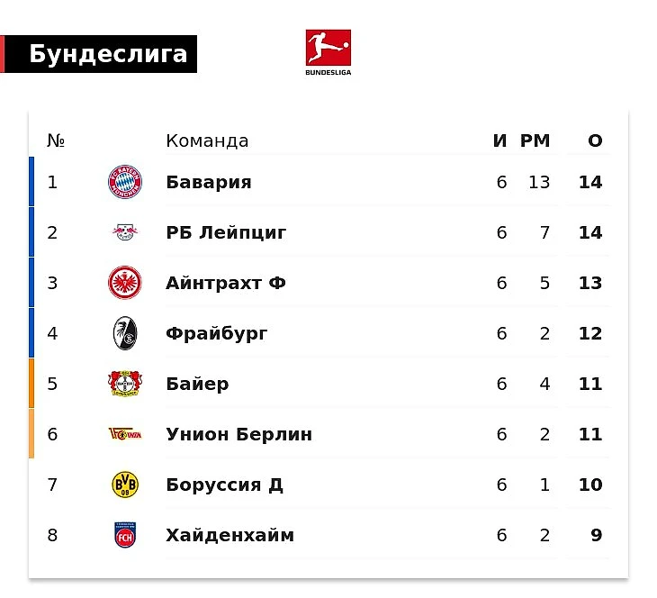При этом мюнхенцы сохранили лидерство в Бундеслиге. Как и у «Лейпцига», у них 14 очков, но есть преимущество по дополнительным показателям. «Айнтрахт» отстает на одно очко, «Фрайбург» – на два, «Байер» и «Унион» – на три (догнать эти два клуба еще может «Штутгарт»).