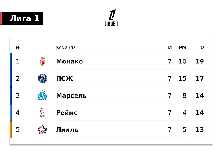 У «ПСЖ», идущего на 2-м месте, 17 очков. Следом идут «Марсель» и «Реймс», набравшие по 14 баллов, на 5-м месте – «Лилль» с 13 очками.