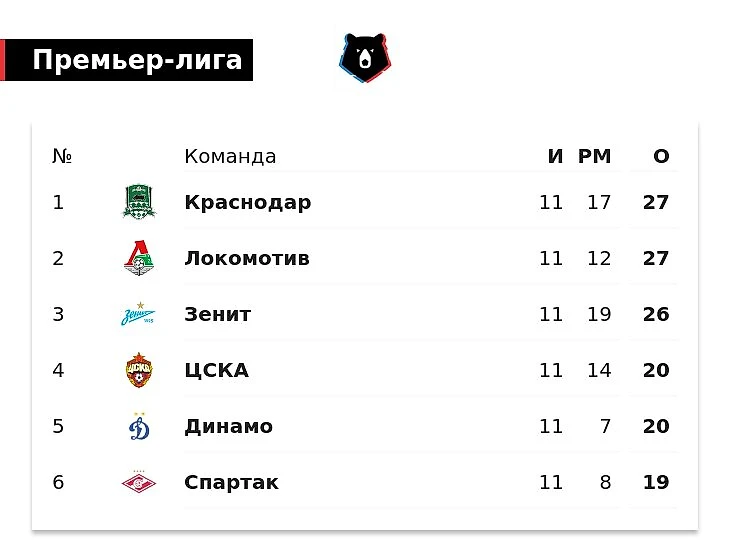 ЦСКА и «Динамо» имеют по 20 очков и занимают 4-е и 5-е места соответственно. «Спартак» с 19 баллами – на 6-й строчке.