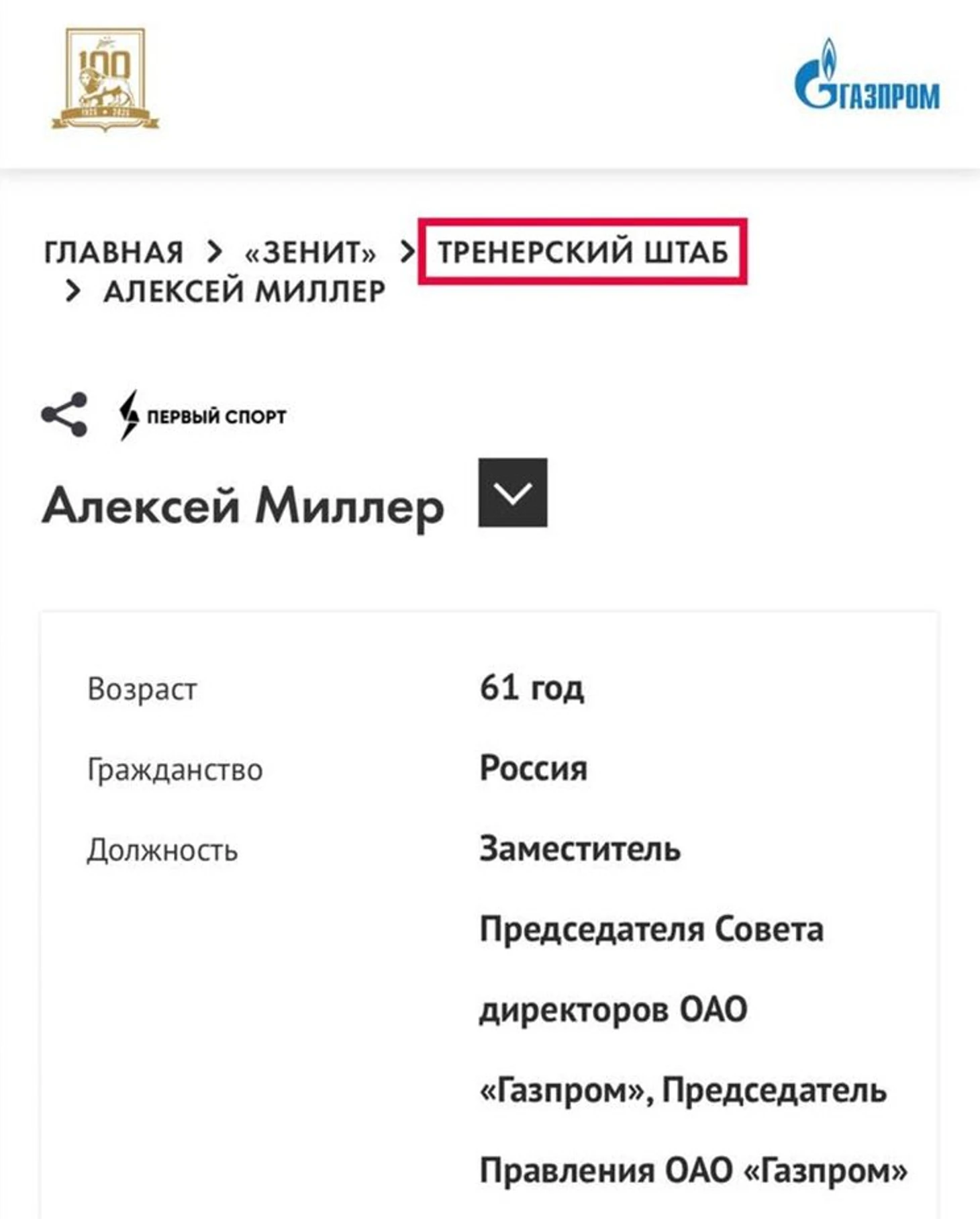 Профиль председателя правления ПАО «Газпром» Алексей Миллера появился в разделе «Тренерский штаб» на сайте «Зенита».