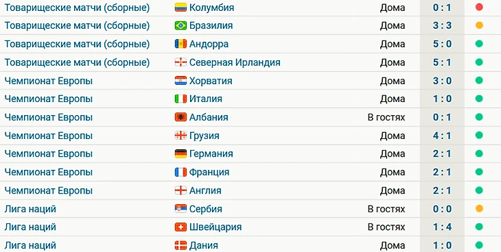 Испания не проигрывает 18 официальных матчей подряд – 16 побед и 2 ничьих. Последнее поражение было в марте 2023-го от Шотландии