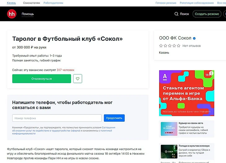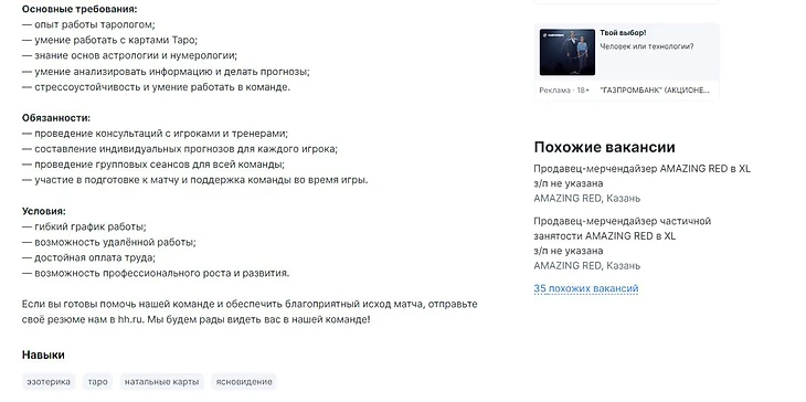 Казанский «Сокол» опубликовал вакансию таролога. Зарплата – от 300 тысяч рублей в месяц, обязанности – проводить групповые сеансы и составлять индивидуальные планы для игроков