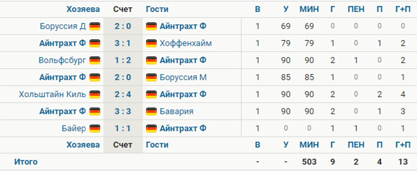 По системе «гол+пас» футболист «Айнтрахта» набрал 13 баллов и находится на первой строчке в лиге.