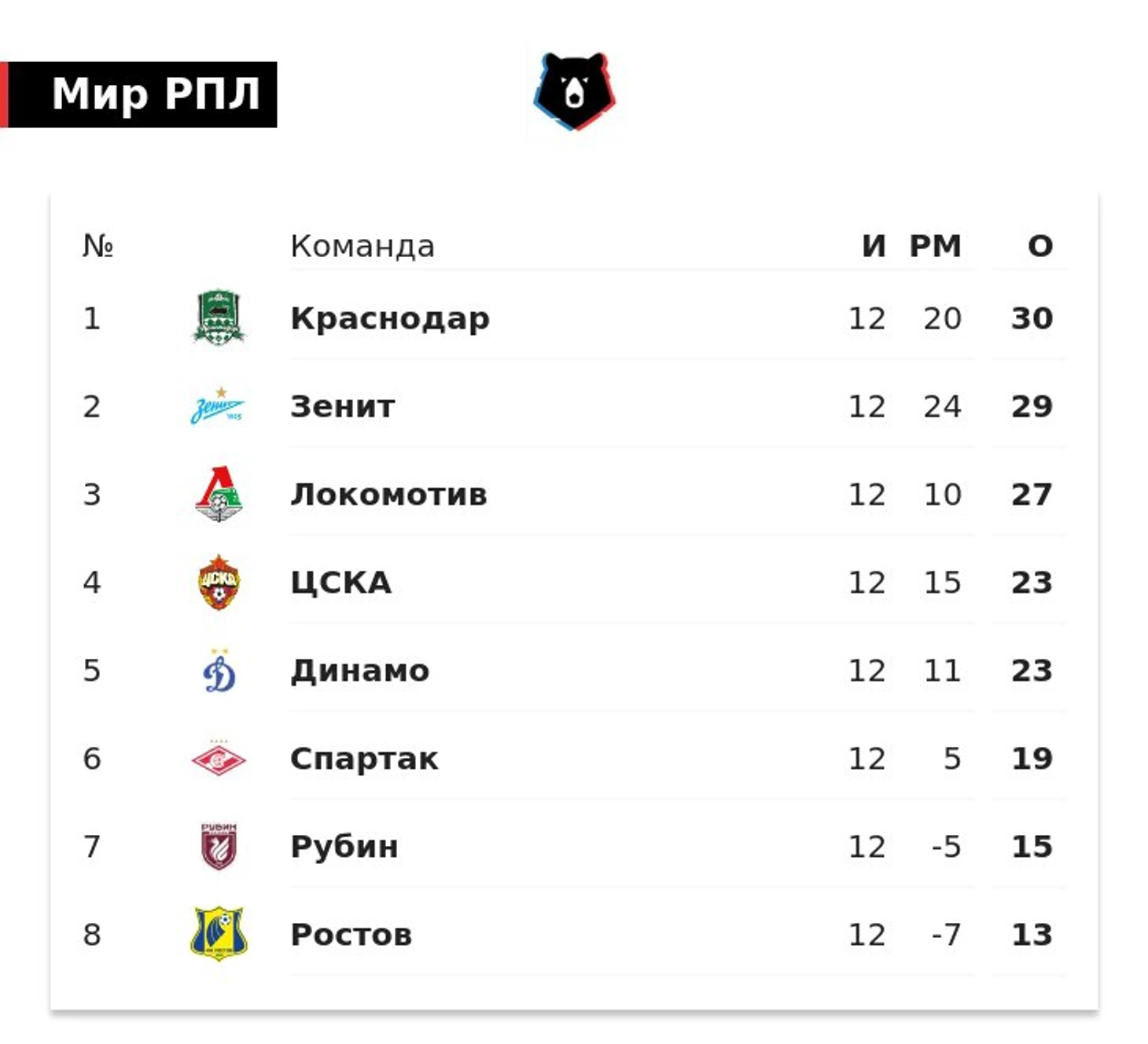 На данный момент она занимает пятую строчку, набрав, как и ЦСКА, 23 очка. Отставание от «Краснодара» – 7 баллов, от «Зенита» – 6, от «Локомотива» – 4.