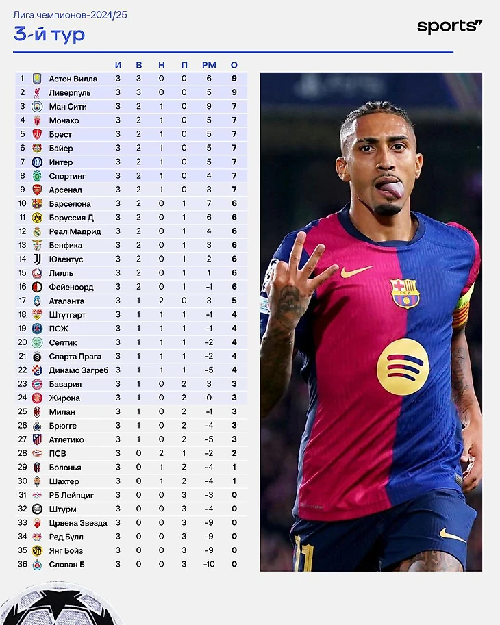 «Астон Вилла» и «Ливерпуль» лидируют в ЛЧ после 3 туров. «Сити» – 3-й, «Барса» – 10-я, «Реал» – 12-й, «Юве» – 14-й, «ПСЖ» – 19-й, «Бавария» – 23-я, «Милан» – 25-й, «Атлетико» – 27-й