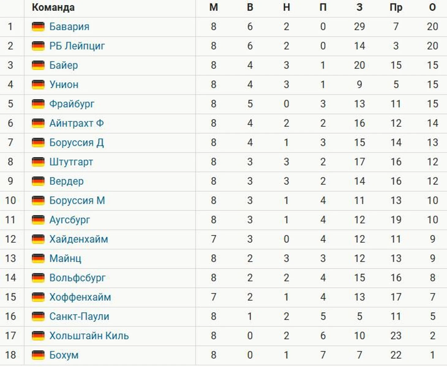 «Бавария» лидирует в Бундеслиге после 8 туров, опережая «Лейпциг» по разнице мячей. «Байер» отстает на 5 баллов, «Дортмунд» – на 7