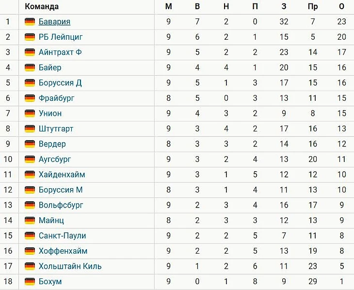 «Бавария» лидирует в турнирной таблице, набрав 23 балла. «Лейпциг» занимает второе место с 20 очками, следом идут «Айнтрахт» (17), «Байер» и дортмундская «Боруссия» (по 16).