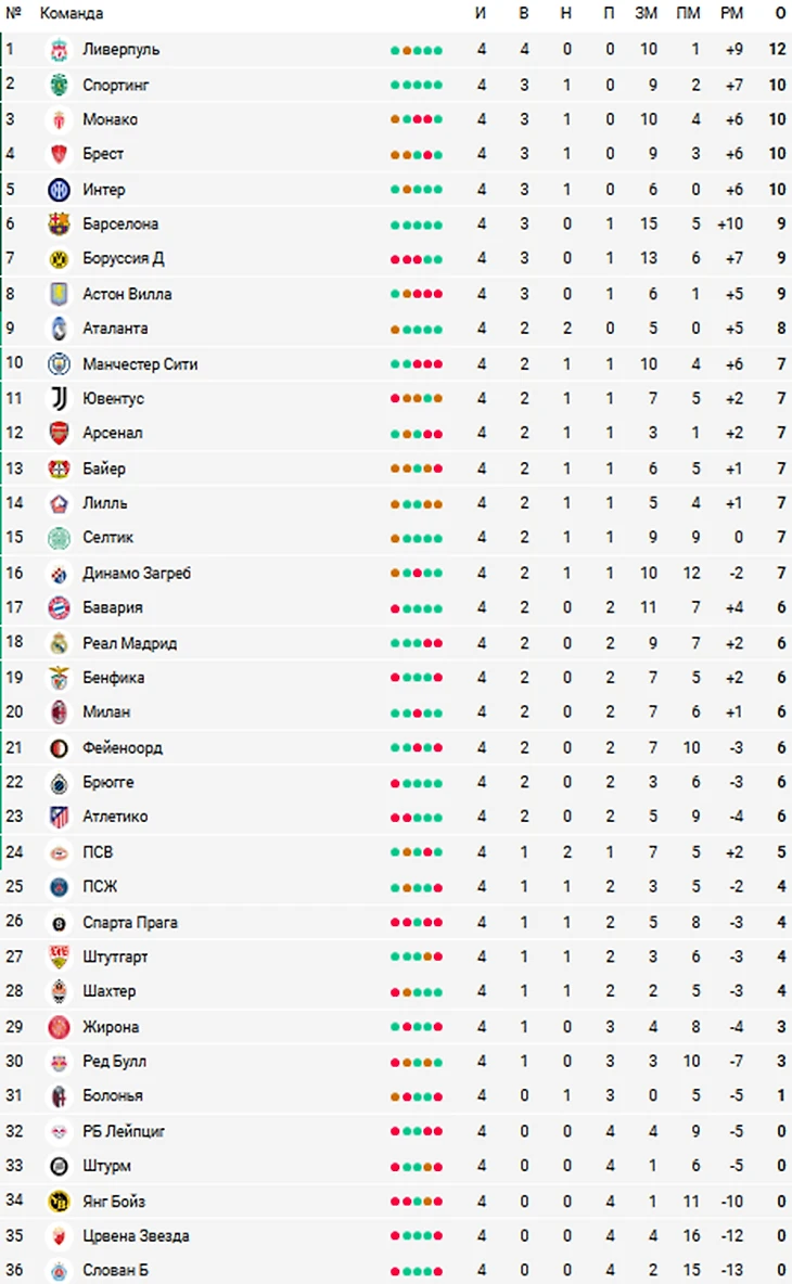 «Ливерпуль» лидирует в таблице ЛЧ после 4-го тура, «Интер» – 5-й, «Барса» – 6-я, «Ман Сити» – 10-й, «Бавария» – 17-я, «Реал» – 18-й, «ПСЖ» – в зоне вылета
