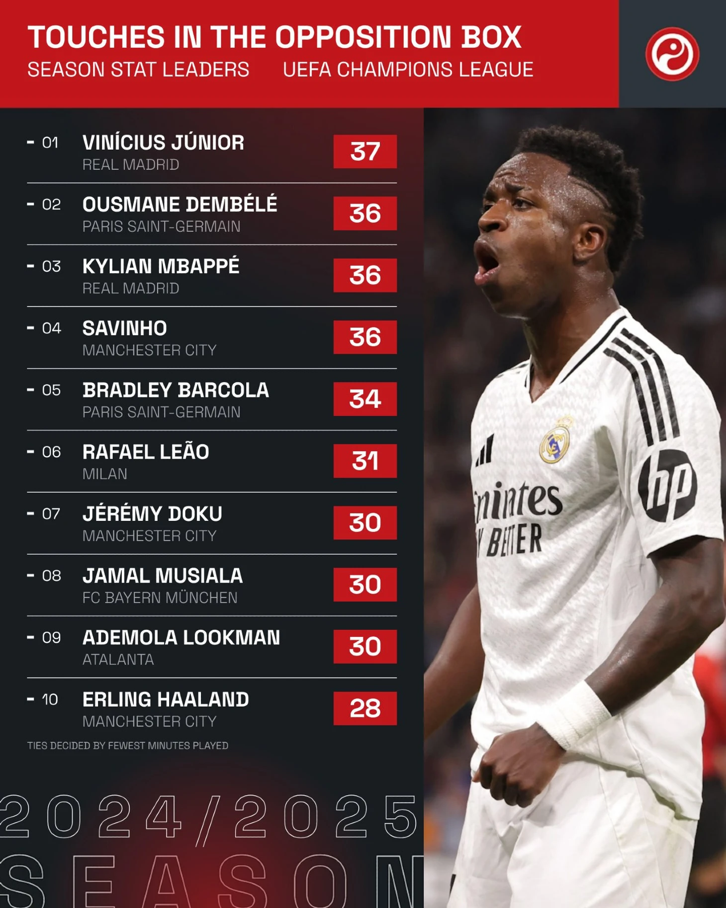 У Винисиуса больше всех касаний мяча в штрафной в сезоне ЛЧ – 37. У Мбаппе и Дембеле по 36, у Холанда – 28