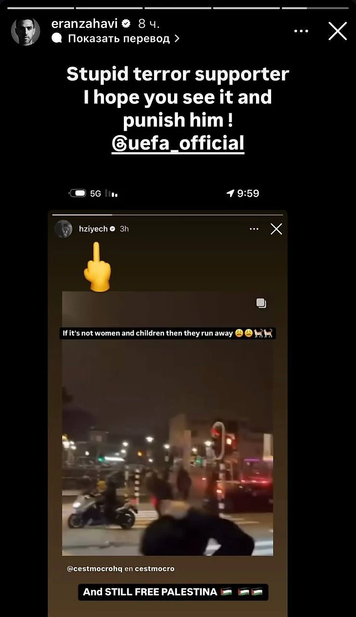«Тупой сторонник террора». Захави из «Маккаби» призвал УЕФА наказать Зиеша за пост об «убегающих» после нападения в Амстердаме израильтянах