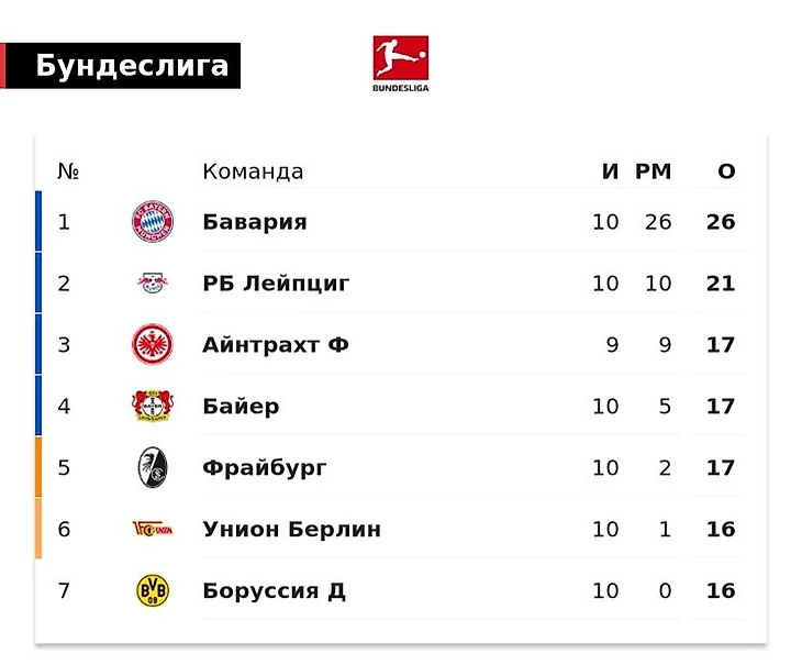 На третьей строчке с 17 баллами располагается «Айнтрахт», который свой матч проведет завтра. Столько же очков у «Байера» и «Фрайбурга», сыгравших вничью с «Бохумом» (1:1) и «Унионом» (0:0) соответственно.