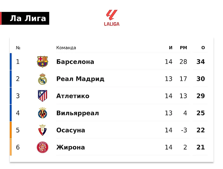 На третьем месте в таблице идет «Атлетико» (29). У «Вильярреала» после 13 игр 25 очков.