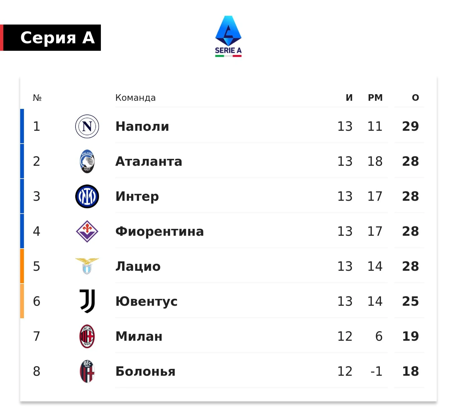 «Наполи» лидирует в Серии А, опережая «Аталанту», «Интер», «Фиорентину» и «Лацио» на 1 очко. «Юве» отстает на 4 балла, «Милан» – на 10 при игре в запасе