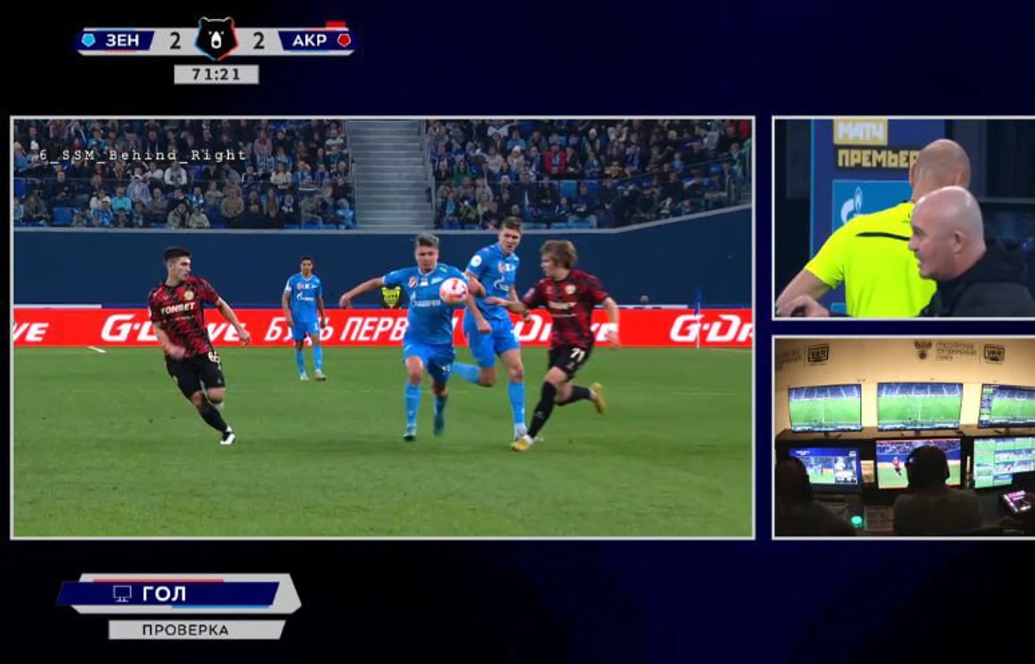 Москалев с ВАР отменил два гола «Зенита» «Акрону» – на 69-й и 98-й. Перед мячами Кассьерры и Гонду была игра рукой
