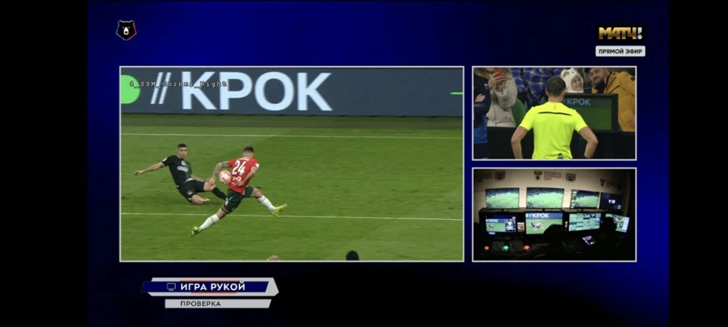 Судья Василий Казарцев после подсказки ВАР отправился к монитору, изучил повтор и решил не назначать пенальти.