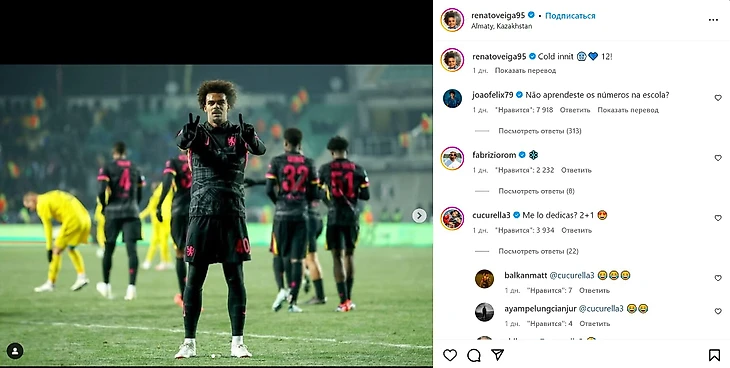 После матча 21-летний португалец выложил фото этого момента и написал: «Холодно, не так ли? 🥶💙 12!»