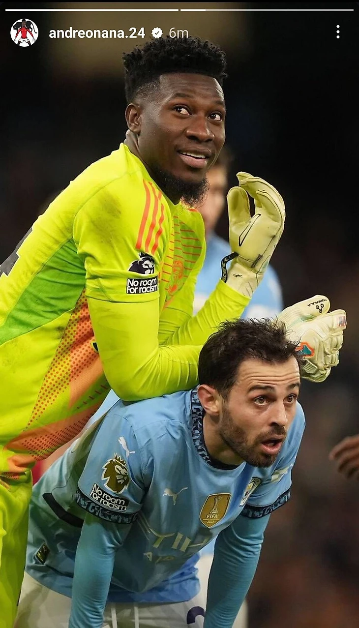 После матча вратарь «МЮ» выложил в соцсетях кадр с игры, на котором Онана стоит облокотившись сбоку на согнувшегося Бернарду Силву.