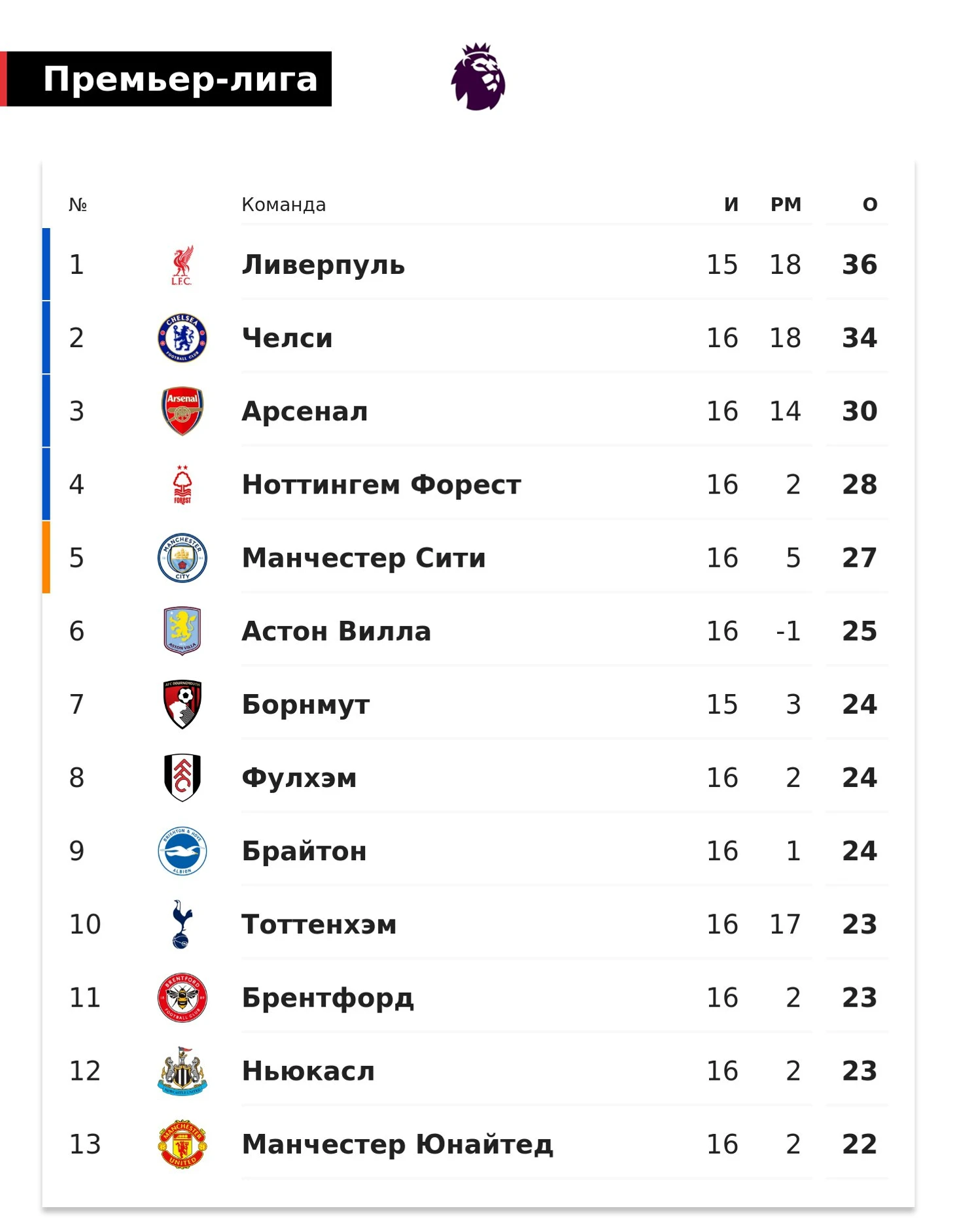 «Челси» сократил отставание от лидирующего «Ливерпуля» до 2 очков, сыграв на матч больше. «Арсенал» – 3-й, «Ман Сити» – 5-й, «МЮ» – 13-й