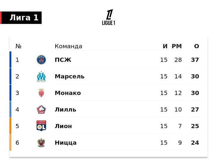 Четвертым идет «Лилль», пятым – «Лион», шестой – «Ницца».