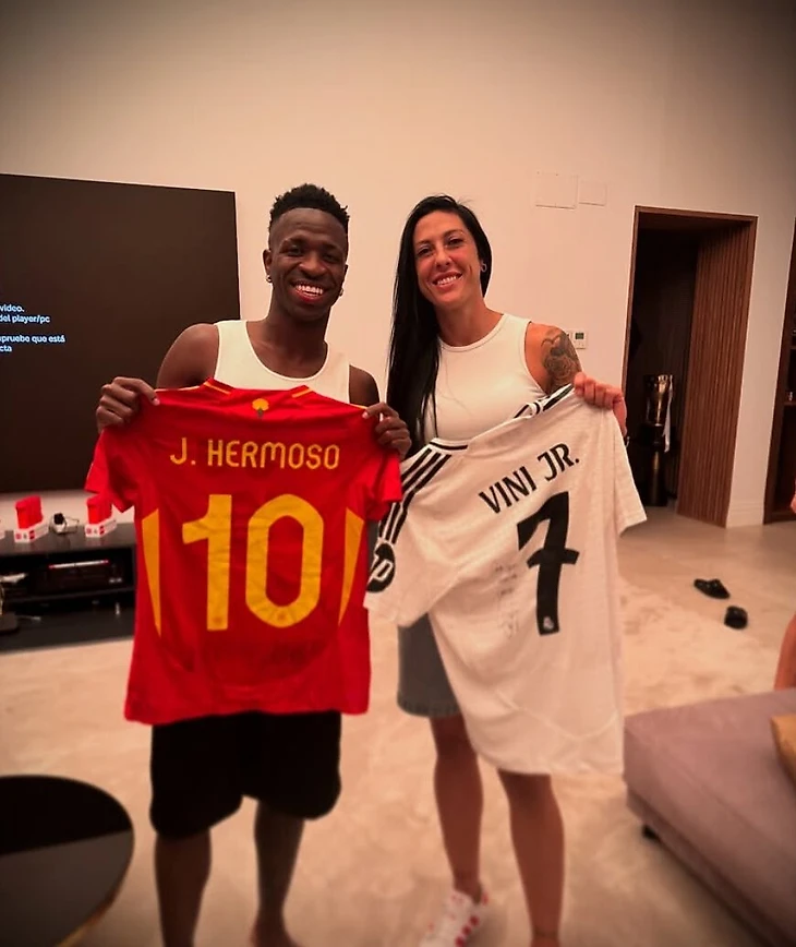 Полузащитница сборной Испании, выступающая за «Тигрес», опубликовала совместную фотографию с вингером «Реала» после того, как обменялась с ним футболками. В подписи к снимку Эрмосо называет бразильца своим другом.