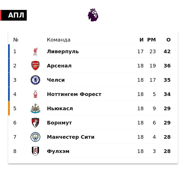 Лидирует в АПЛ «Ливерпуль», у него 42 очка. «Арсенал» отстает от «красных» на 6 баллов, проведя на одну игру больше.