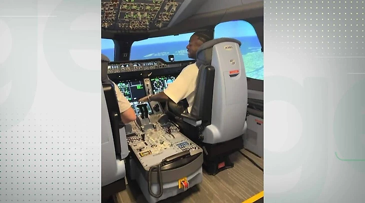 Винисиус Жуниор занял место пилота самолета на тренажере.