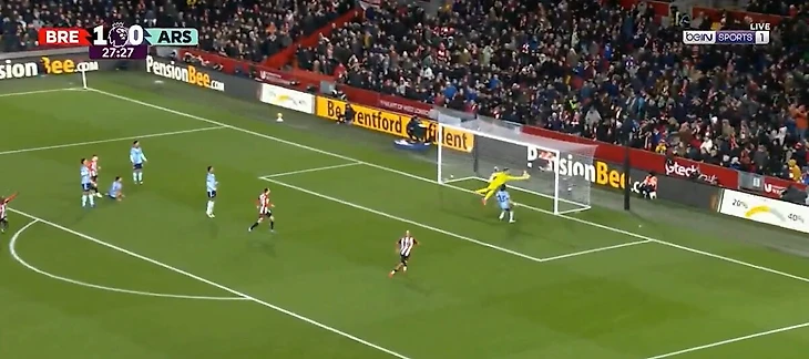 Голкипер «Арсенала» не смог поймать мяч после удара игрока «Брентфорда» из-за пределов штрафной площади на 28-й минуте матча – мяч полетел в створ ворот, выскользнув из его рук. Однако Райя успел вынести мяч с линии ворот.