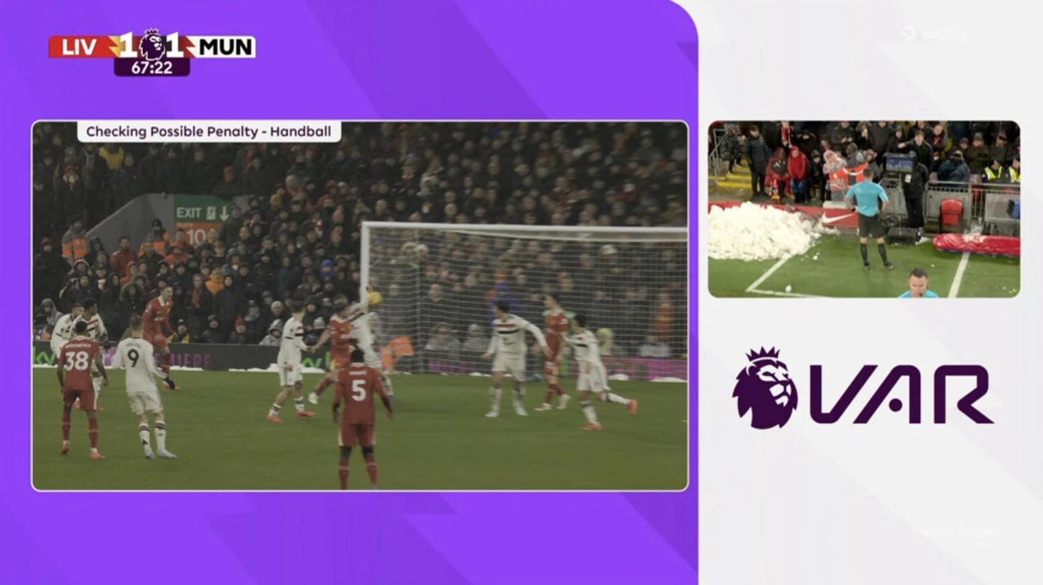 На 67-й минуте игры 20-го тура АПЛ мяч после удара головой Диогу Жоты попал в поднятую руку Маттейса де Лигта в штрафной площади «МЮ».