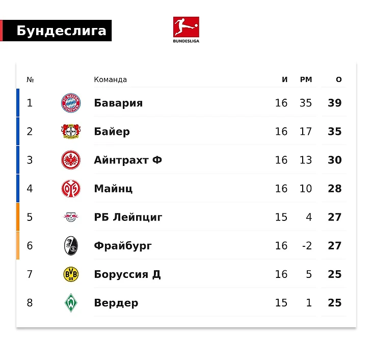 На втором месте идет «Байер» с 35 баллами. Тройку замыкает «Айнтрахт» Франкфурт – 30 очков.