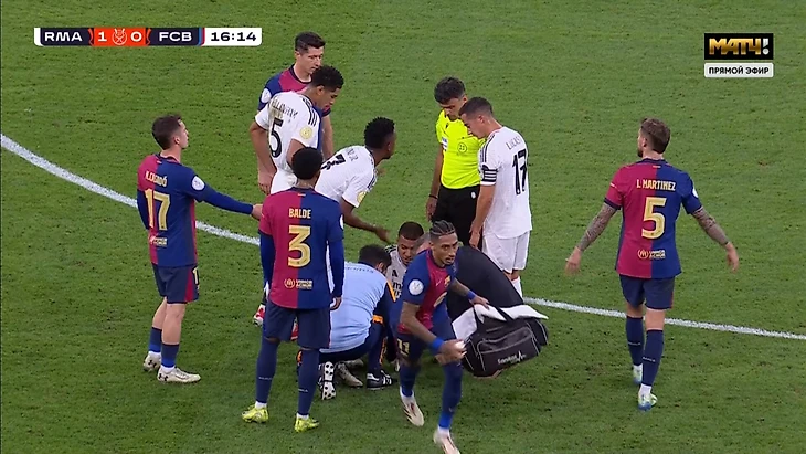 Мбаппе повредил голеностоп в игре с «Барселоной». Рафинья унес сумку врачей «Реала» за пределы поля, пока Килиану накладывали повязку у центрального круга
