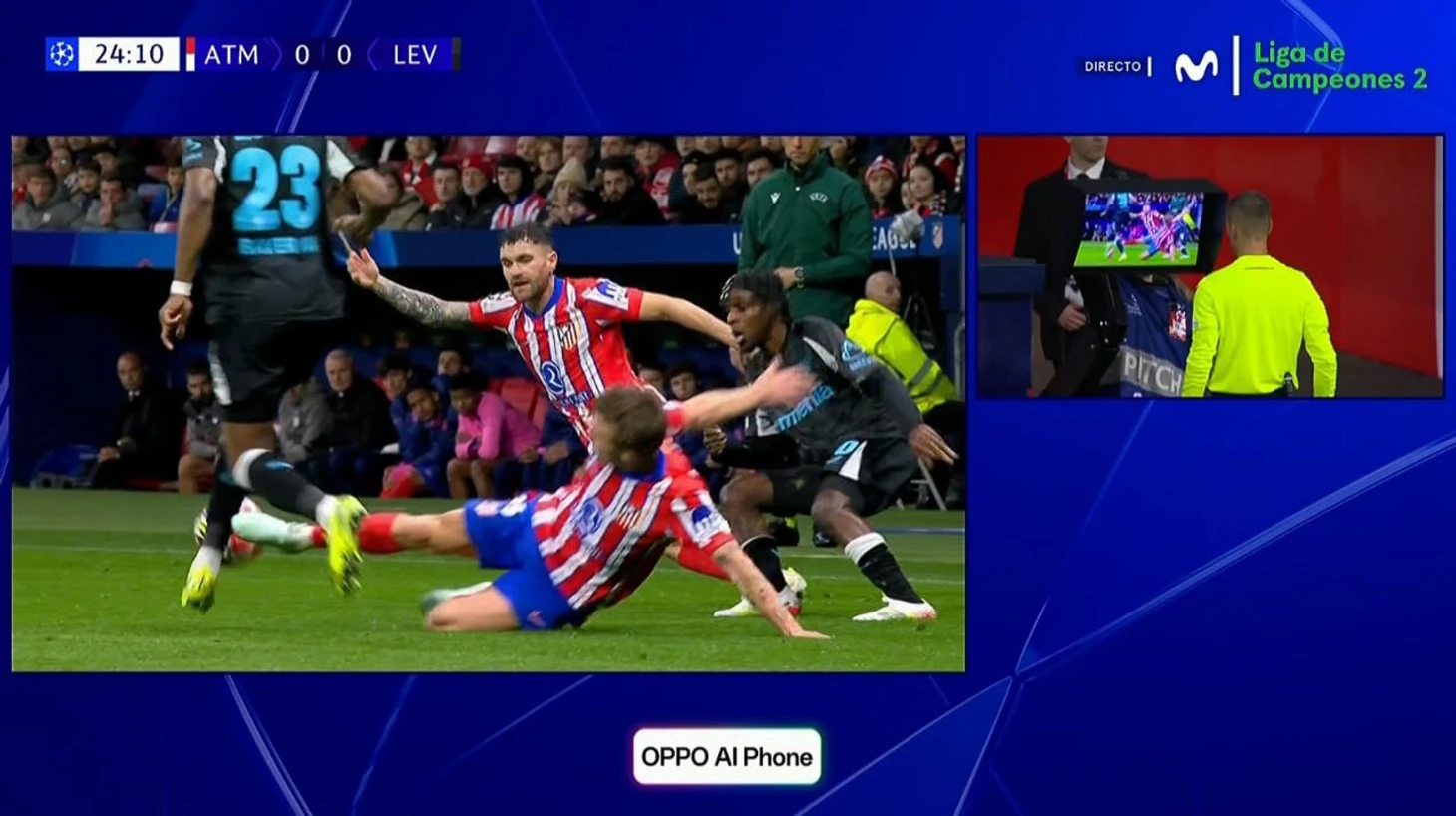 «Атлетико остался в меньшинстве на 25-й минуте матча с «Байером». Барриос после ВАР получил прямую красную за подкат против Мукиеле