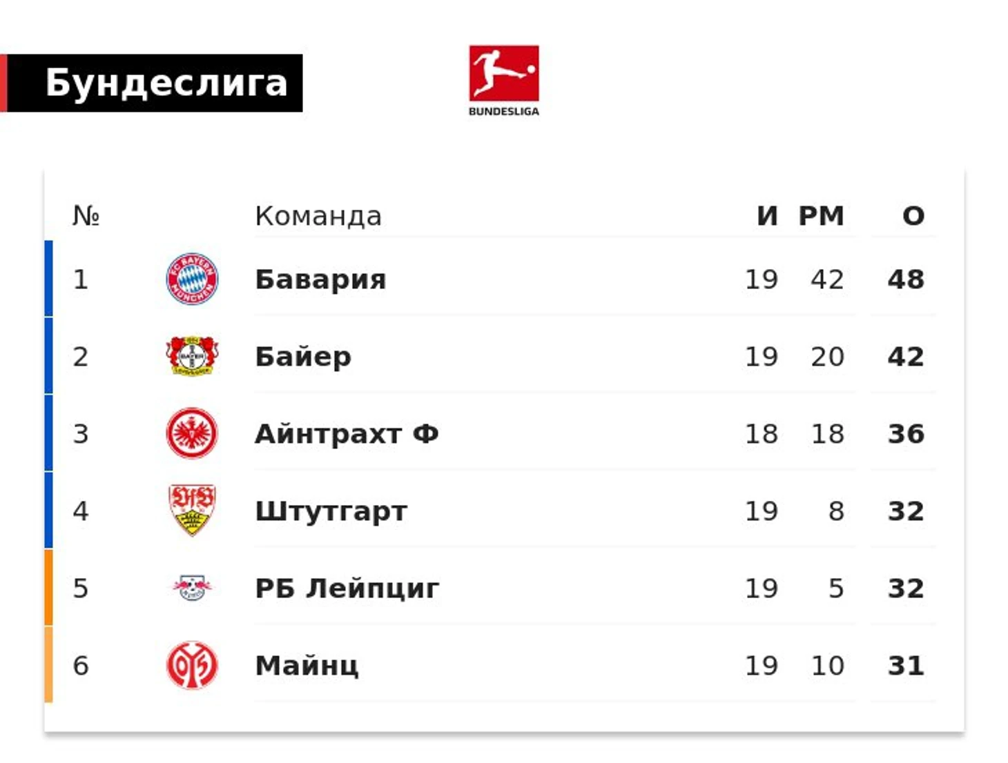 На счету мюнхенцев 48 очков, они занимают первое место в таблице. «Байер» набрал 42 балла, «Айнтрахт» – 36 (есть игра в запасе), «Штутгарт» и «Лейпциг» – по 32.