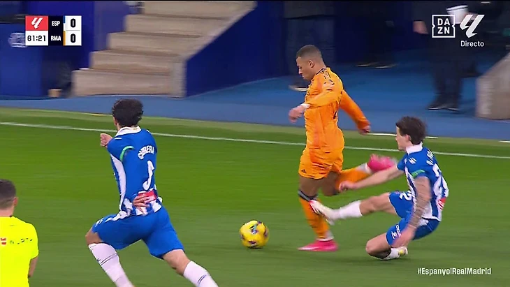 На 60-й минуте «Реал» начал контратаку, в ходе которой защитник «Эспаньола» сбил французского нападающего в подкате сзади. Перед падением Мбаппе успел сделать передачу, поэтому игра продолжилась.