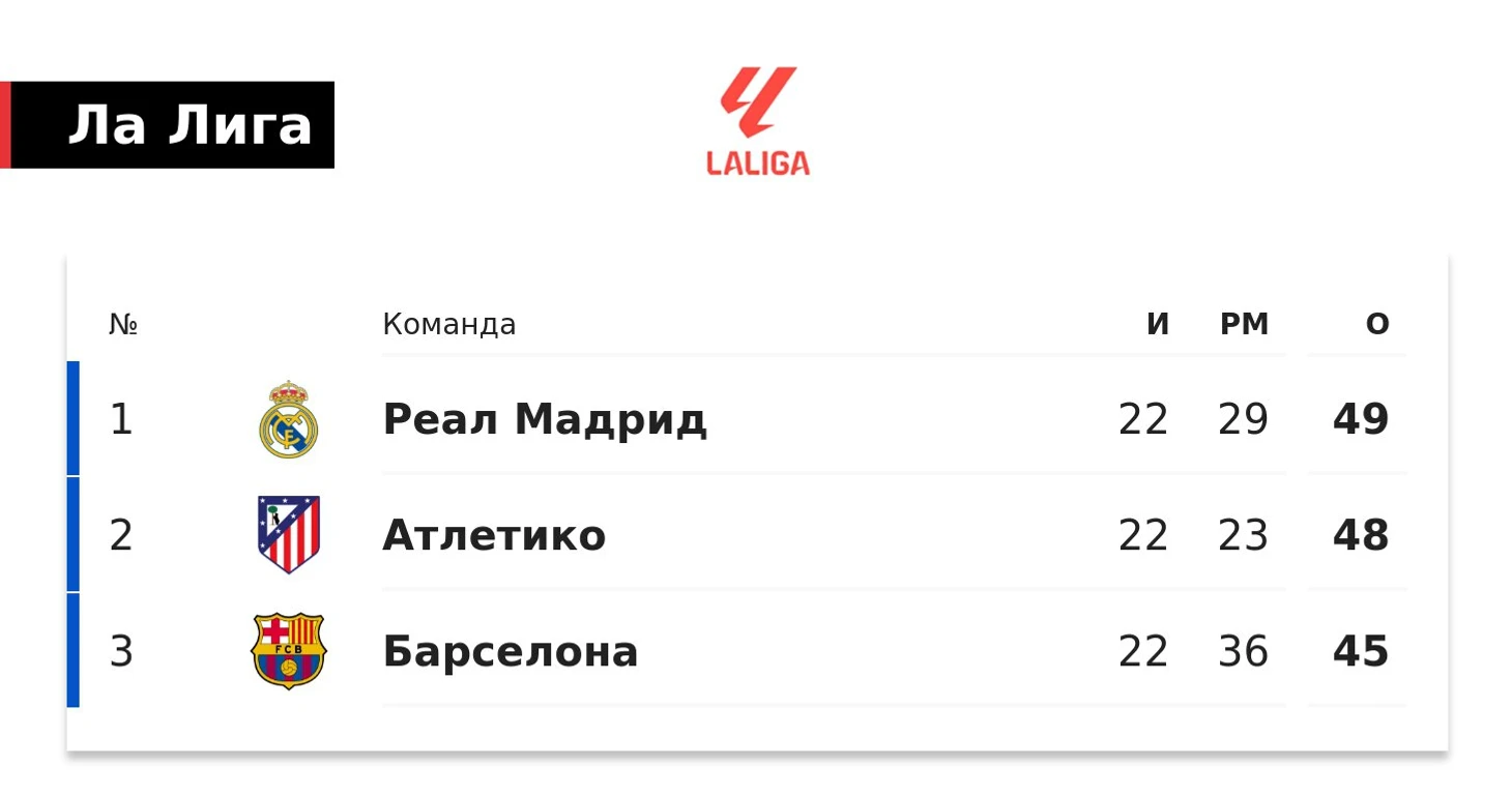 Все команды топ-3 провели матчи в этом туре. «Барса» выиграла у «Алавеса» (1:0), «Атлетико» был сильнее «Мальорки» (2:0), а «Реал» проиграл «Эспаньолу» (0:1).