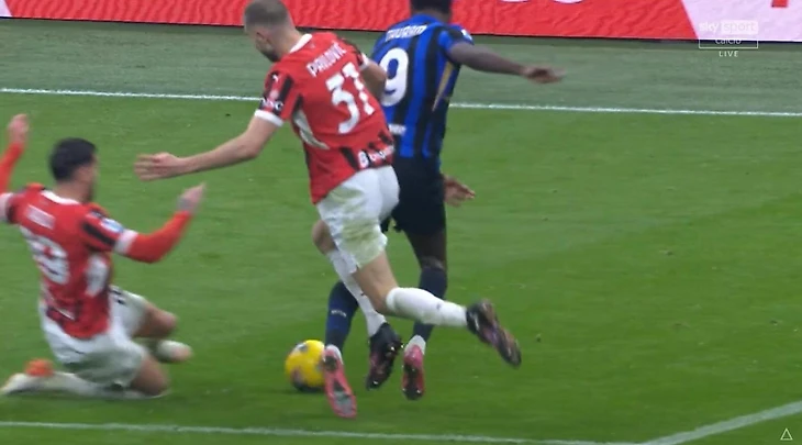 На 74-й минуте защитник «Милана» Страхиня Павлович преследовал форварда «Интера» Маркуса Тюрама и в штрафной площади задел ногу соперника.