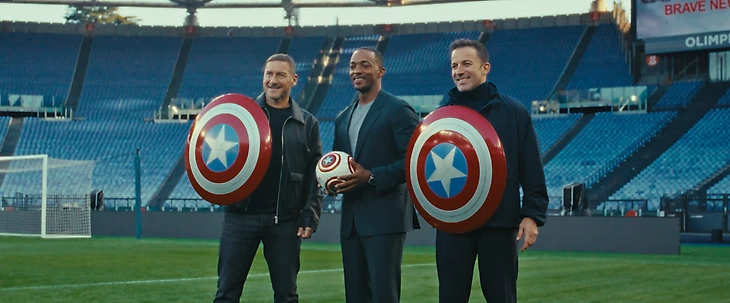 Действие ролика происходит в Риме. Тотти и Дель Пьеро жонглируют и пасуют друг другу мяч, рисунок на котором напоминает щит Капитана Америки, по дороге на «Стадио Олимпико». На стадионе экс-игроки сборной Италии встречают актера Энтони Маки, исполнившего главную роль в фильме.