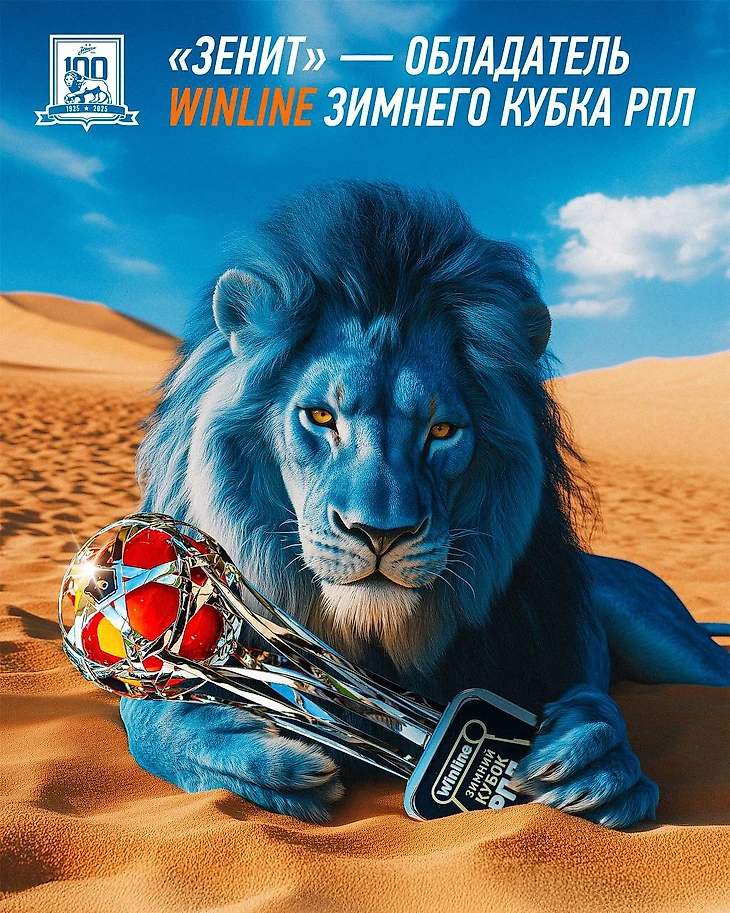 После матча в телеграм-канале «Зенита» было опубликовано изображение голубого льва на фоне песчаной пустыни, держащего трофей Winline Зимнего кубка РПЛ.