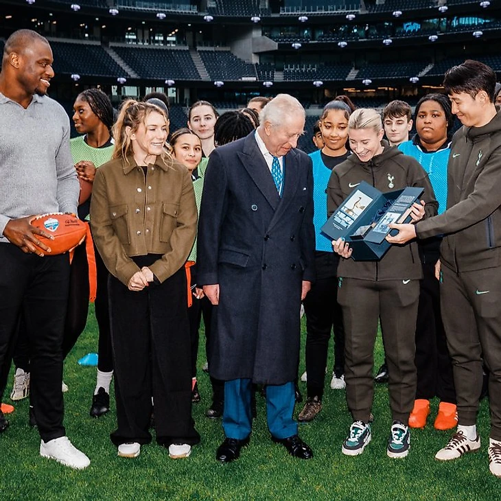 Карлу III представили капитанов мужской и женской команд клуба – Сон Хын Мина и Бетани Ингланд. Эфе Обаде, британско-нигерийский игрок команды НФЛ «Вашингтон Коммандерс», и Фиби Шектер, капитан женской сборной Великобритании по флаг-футболу, проводили короля на поле, где его приветствовали собравшиеся на трибунах ученики местных школ.