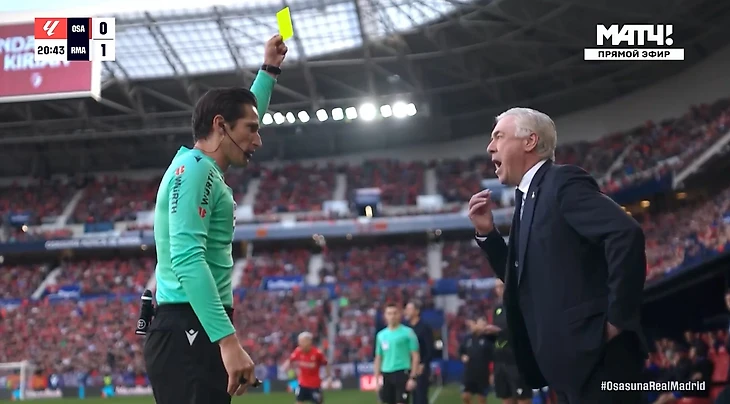 Анчелотти получил желтую, несколько раз указав судье Монтеро на попадание Вальверде в руку Крусу в штрафной «Осасуны»