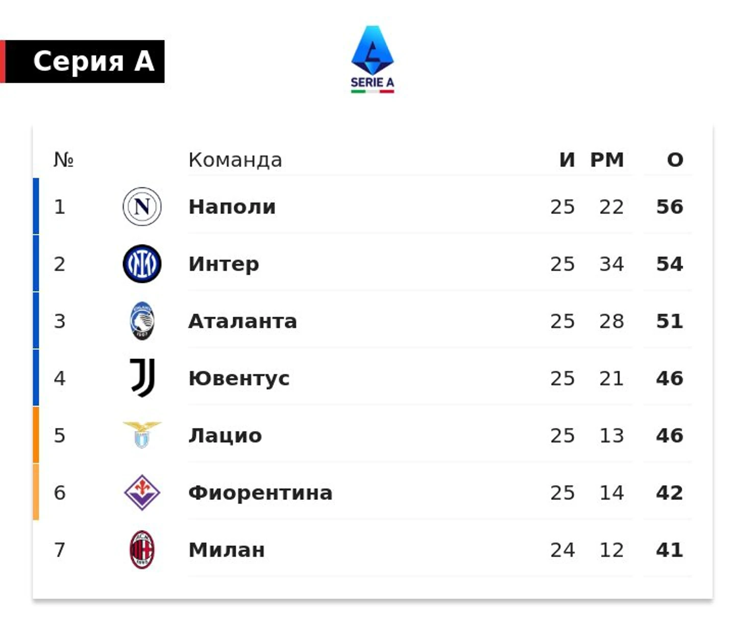 «Наполи» на 2 очка опережает «Интер» после 25-го тура Серии А. «Аталанта» отстает на 5 баллов