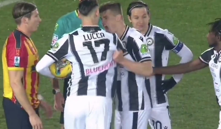 Игроки «Удинезе» поругались из-за пенальти: форвард Лукка забрал мяч и не отдавал, хотя команда хотела, чтобы бил Товен. Лоренцо забил, его заменили сразу после гола