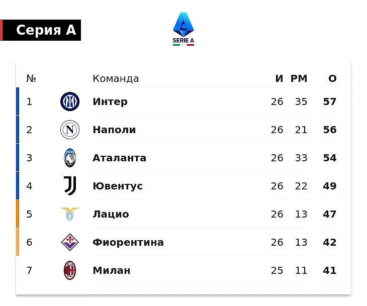 В чемпионате Италии «Ювентус» идет на 4-м месте с 49 очками. Выше него только «Аталанта» (54), «Наполи» (56) и «Интер» (57).