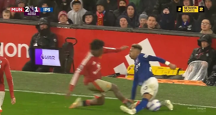 На 40-й минуте матча 27-го тура АПЛ защитник «Манчестер Юнайтед» попытался дотянуться до мяча, которым владел хавбек Омари Хатчинсон, и наступил тому на голень.