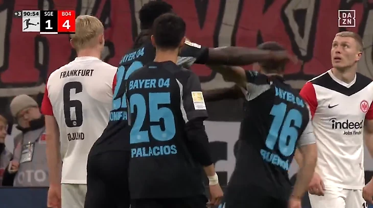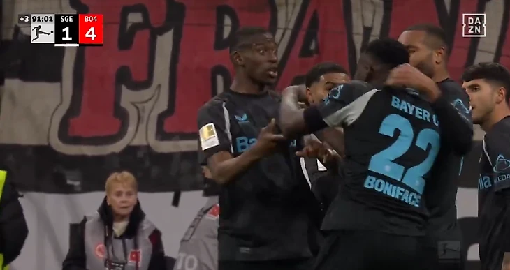 Бонифасе устроил стычку с Буэндиа при счете 4:1 в пользу «Байера»: Эмилиано помешал форварду пробить. Виктора успокаивали вчетвером