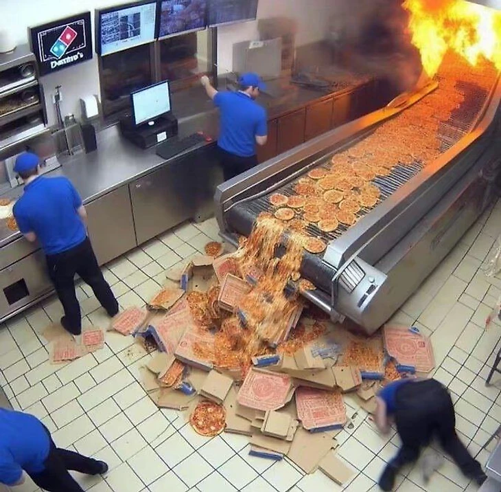 В британском аккаунте сети пиццерий появилась картинка, на которой несколько десятков пицц съезжают с конвейера и беспорядочно падают в огромную кучу на полу, а часть затронута серьезным возгоранием.