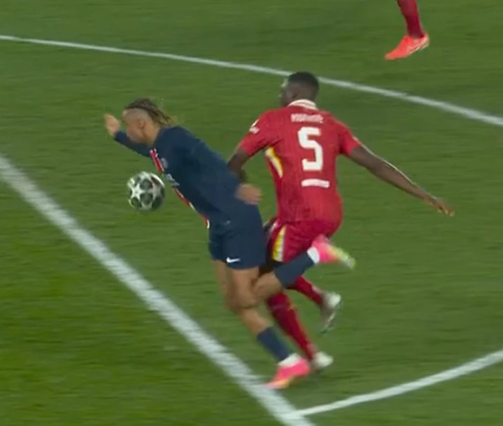 На 27-й минуте вингер «ПСЖ» Брэдли Барколя упал на границе штрафной после контакта с защитником «Ливерпуля» Ибраима Конате.