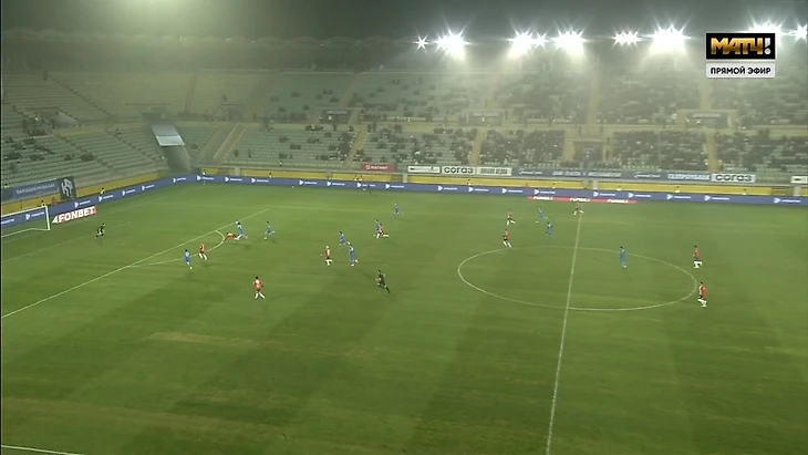 Примерно через 8 секунд после начала второго тайма защитник Сослан Кагермазов, пытаясь помешать форварду Дмитрию Воробьеву принять мяч после заброса и выбежать к воротам хозяев, подтолкнул соперника в спину, и тот упал на газон.