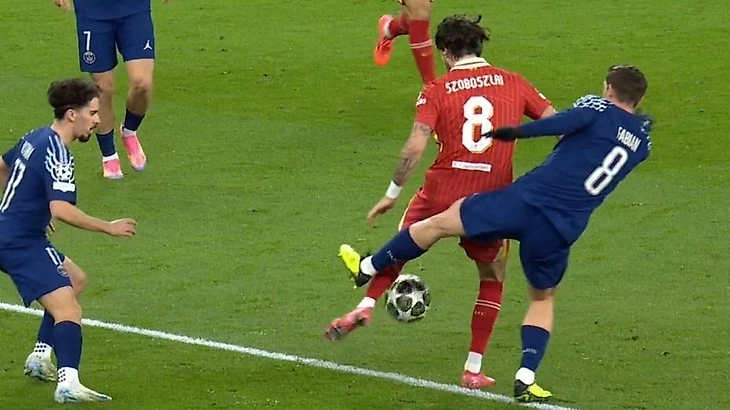 Руис задел ноги Собослаи на границе штрафной «ПСЖ», хавбек «Ливерпуля» упал. Судья Ковач не зафиксировал фол, ВАР не вмешался