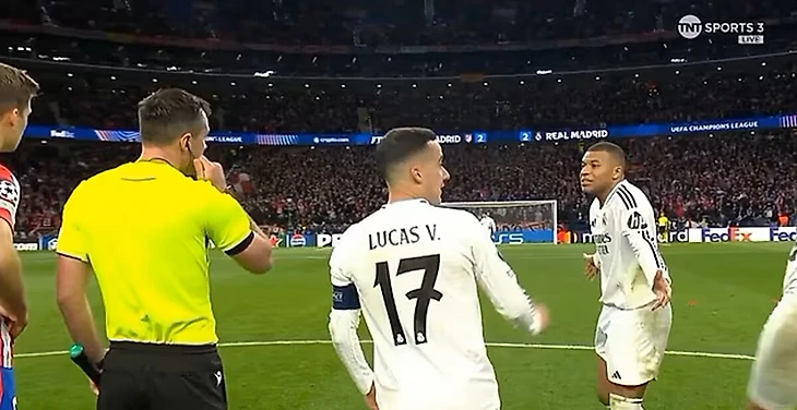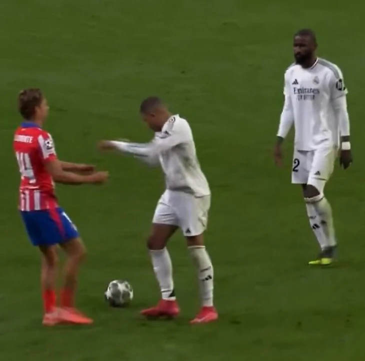 Сразу после удара аргентинца Мбаппе, стоявший в центре поля с партнерами по команде, обратился к помощнику Марчиняка, находившемуся рядом, и словами и жестами стал объяснять рефери, что игрок «Атлетико» коснулся мяча обеими ногами.